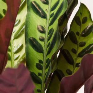 Calathea Pin Stripe or Calathea Ornata are tropical plants with pink pinstripes decorating their large waxy deep green and maroon coloured leaves, which beautifully dance according to the circadian rhythm.